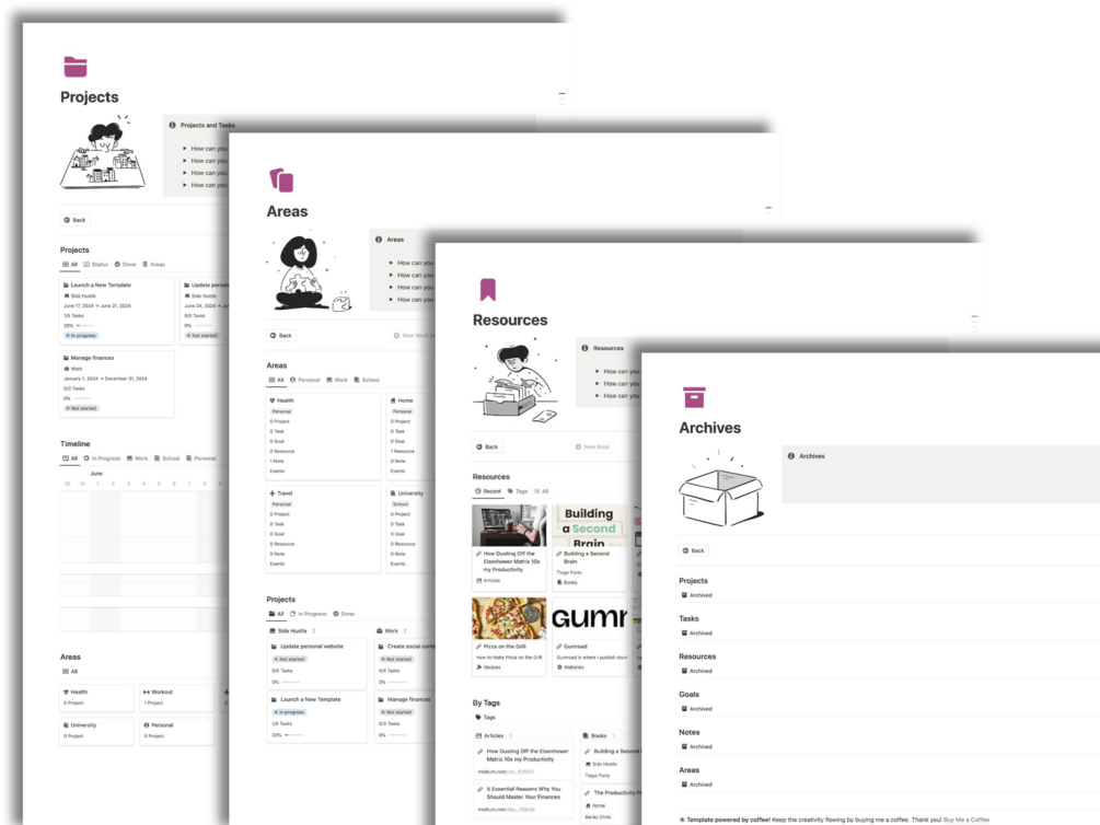 Take control of your life with the Notion Second Brain template, your all-in-one solution for task and project management, knowledge organization, goals monitoring, life planning, and more. Perfect for anyone looking to stay organized and productive, this template harnesses the power of the PARA method by Tiago Forte to streamline your daily responsibilities.